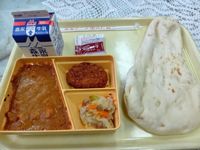 今日の献立は、ナン、バターチキンカレー、野菜炒め、コーンコロッケ、牛乳です。