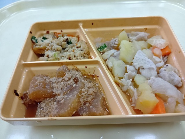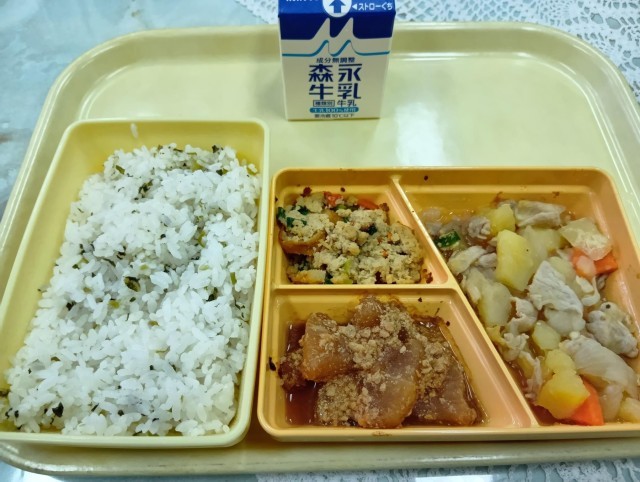 今日の献立は、ご飯、塩ぶたじゃが、大根の肉みそ煮、卯の花、牛乳です。