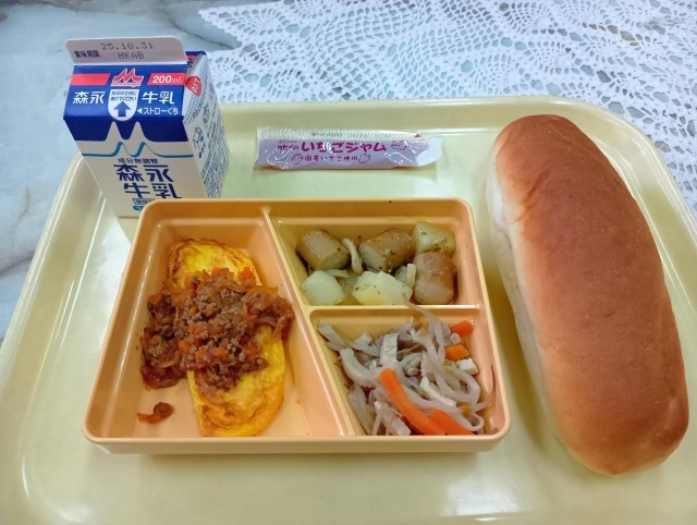 今日の給食 公開日 2025/10/21 更新日 2025/10/21 給食 今日の献立は、コッペパン、オムレツミートソース、ソーセージとキノコのアヒージョ風、もやしのサラダ、イチゴジャム、牛乳です。 いいね(0)