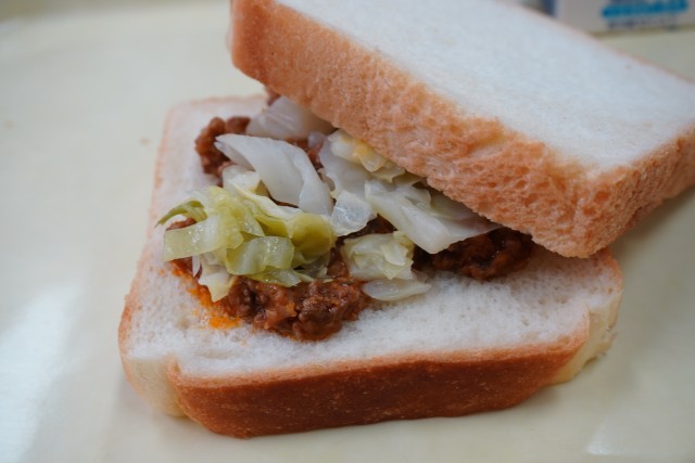 今日の献立は、食パン、ミートサンド、キャベツソテー、ポトフ、ヨーグルト、牛乳です。