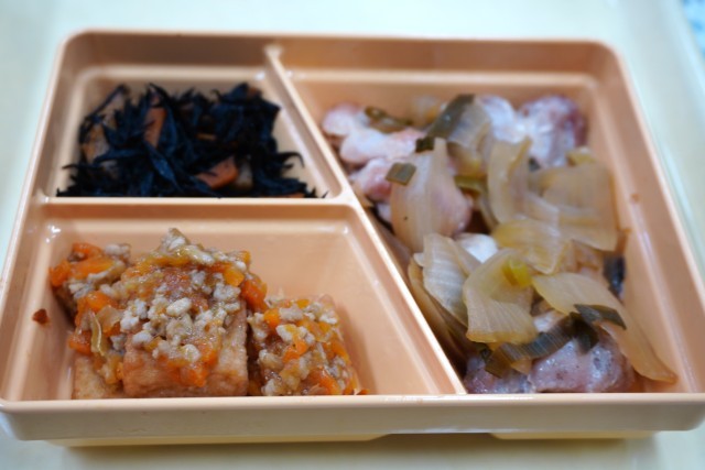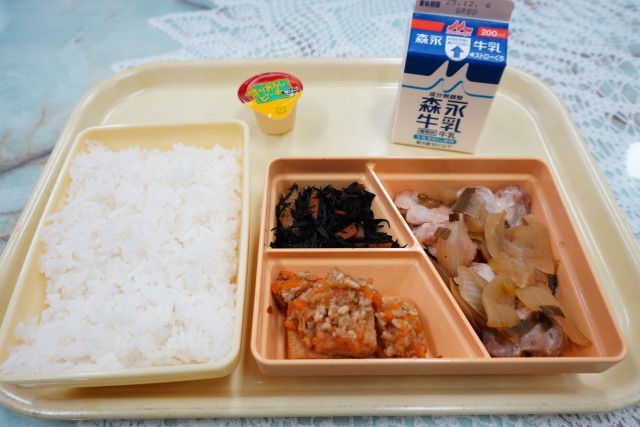 今日の献立は、ご飯、鶏ぽん、厚揚げの肉みそかけ、ひじきの煮物、プチすりおろしピーチゼリー、牛乳です。