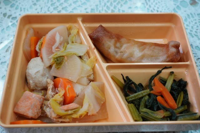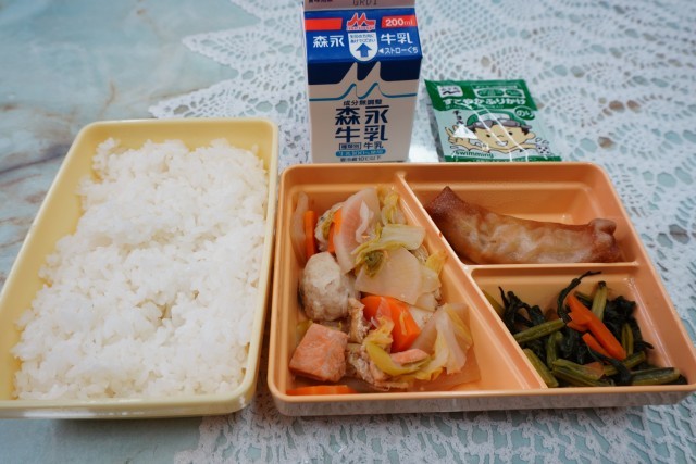 今日の献立は、ご飯、ちゃんこ煮、春巻、小松菜の和え物、ふりかけ、牛乳です。