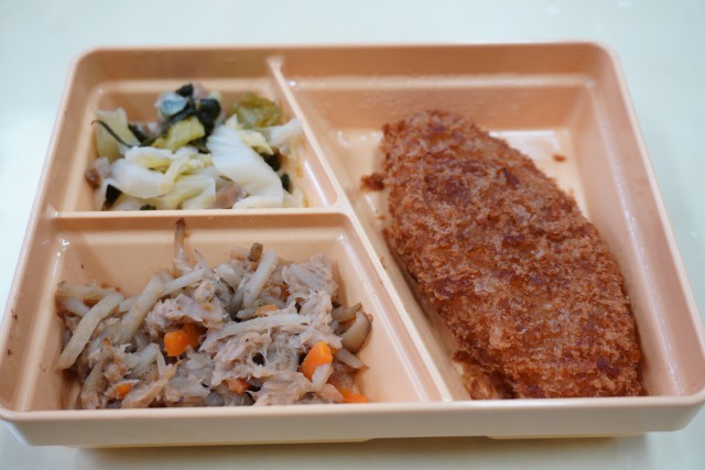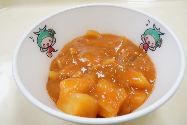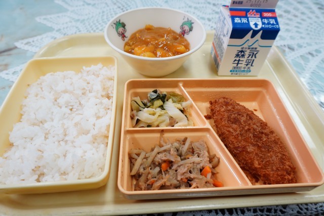 今日の献立は、もち玄米ご飯、コーンコロッケ、ゴボウサラダ、チンゲン菜の炒め物、チキンカレー、牛乳です。