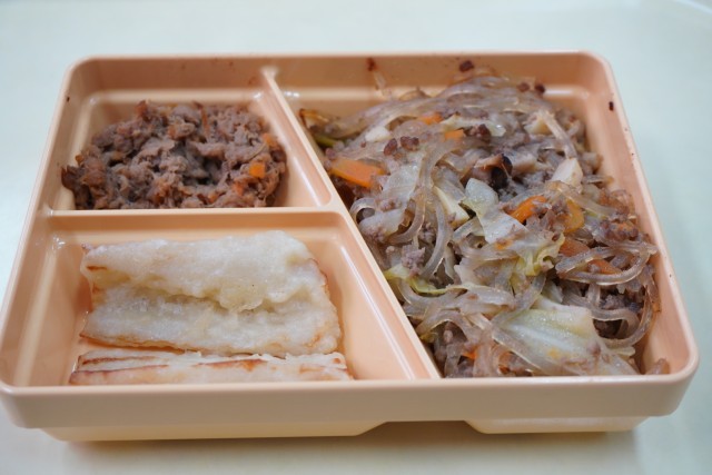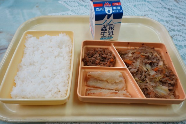 今日の献立は、ご飯、春雨のひき肉炒め、ちくわの天ぷら、かつおそぼろ、牛乳です。