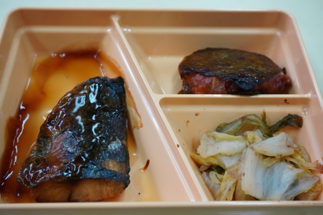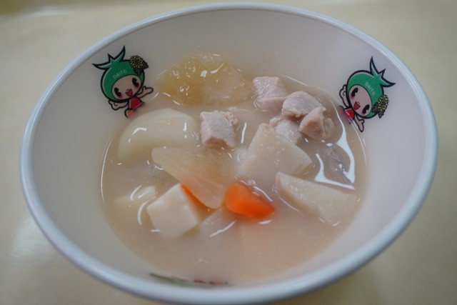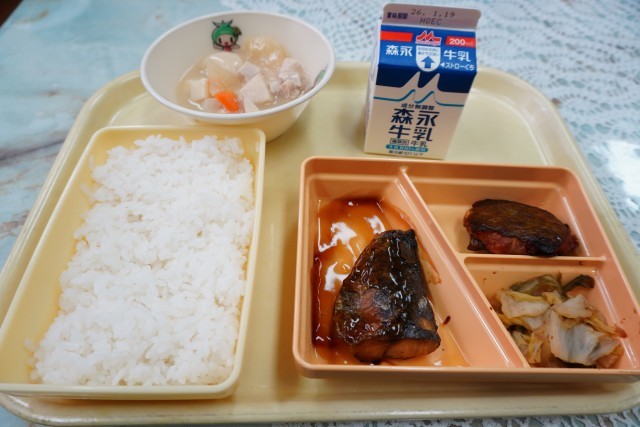 今日からおいしい給食が始まります。今日は正月献立ということで、ごはん、鰆のしょうがあん、れんこん磯辺揚げ、白菜のおかか、雑煮、牛乳です。