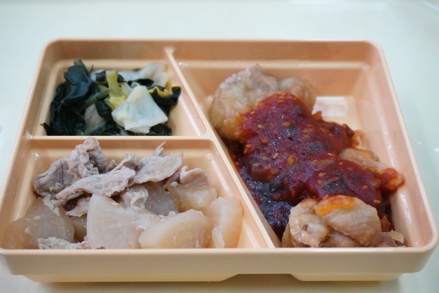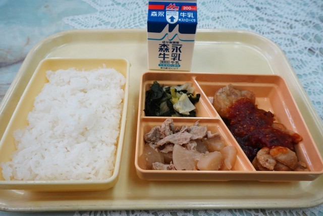 今日の献立は、ごはん、韓国風ヤンニョムチキン、豚肉と大根の煮物、おひたし、牛乳です。