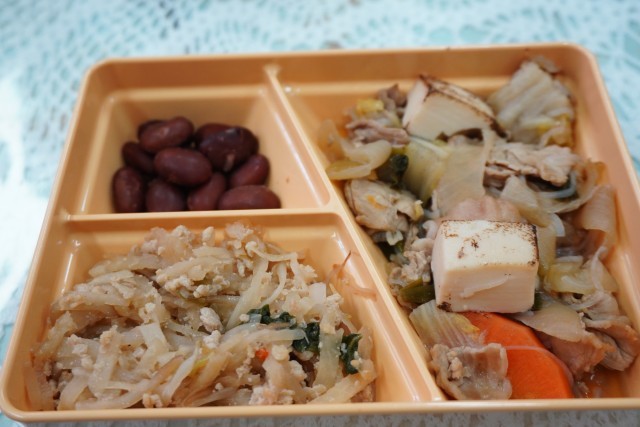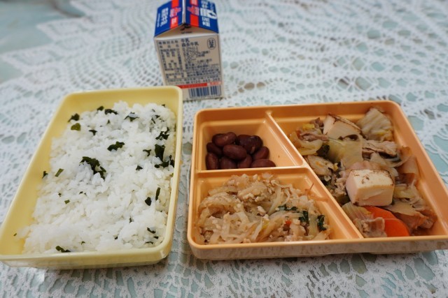 今日の献立は、わかめご飯、豚肉のすき焼き風、切り干し大根のピリ辛炒め、金時豆の煮物、牛乳です。