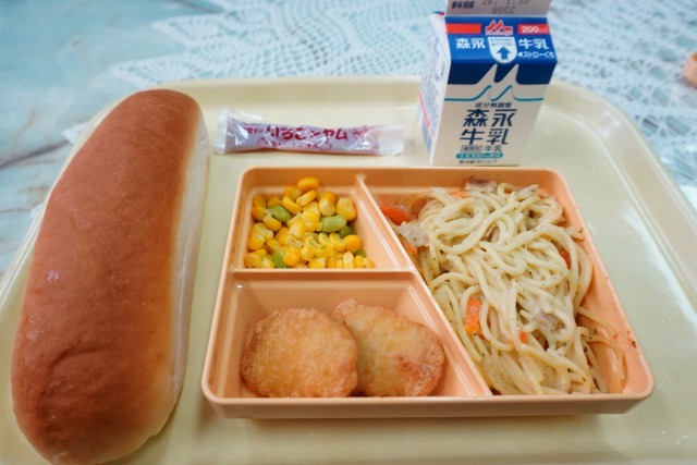 今日の献立は、コッペパン、クリームスパゲティ、枝豆コーン、イチゴジャム、チキンナゲット、牛乳です。