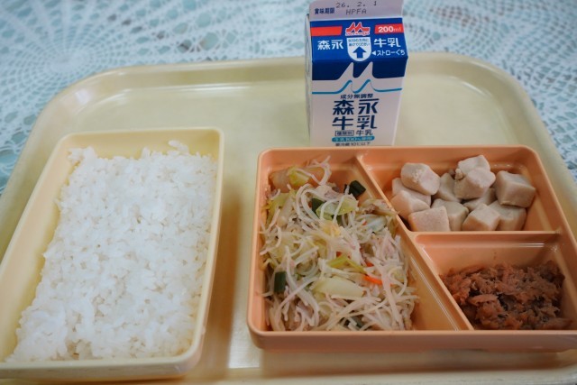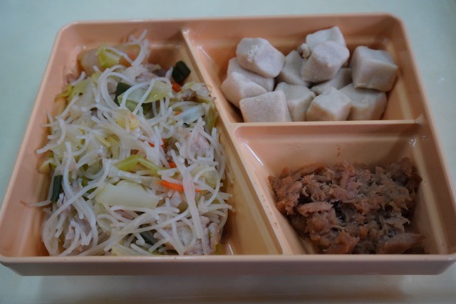 今日の献立は、ご飯、炒めビーフン、高野豆腐の含め煮、シーチキンのそぼろ煮、牛乳です。
