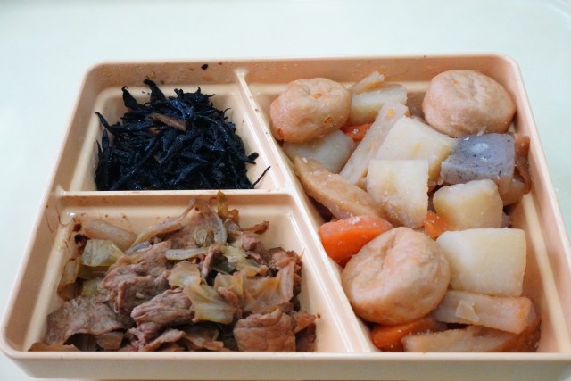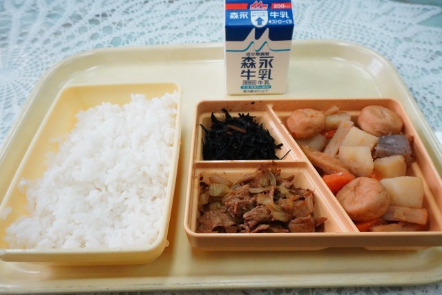 今日の献立は、ご飯、関東煮、豚肉とキャベツのみそ炒め、ひじきの煮物、牛乳です。