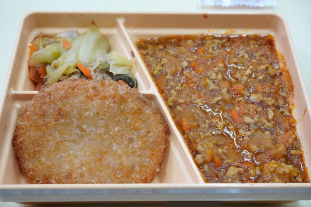 今日の献立は、ご飯、ドライカレー、ポテトコロッケ、チンゲン菜とツナの炒め物、ミルメーク、牛乳です。