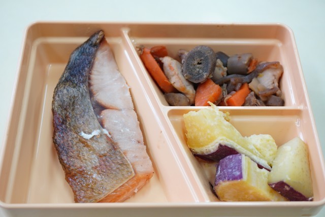 菜飯、塩鮭、炒り鶏煮、さつまいもの甘煮、すだちゼリー、牛乳です。