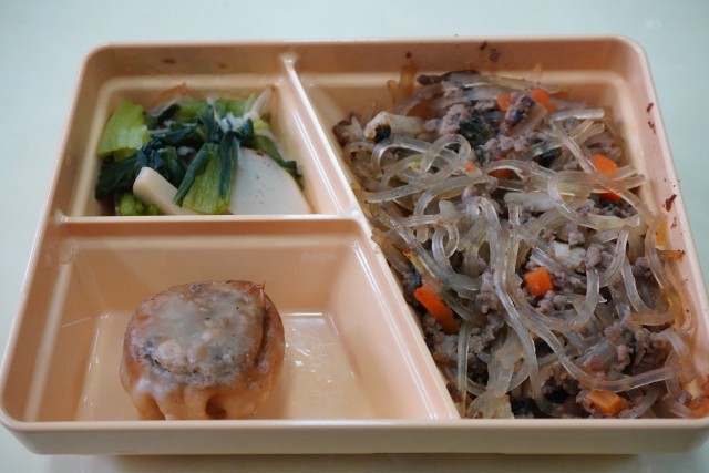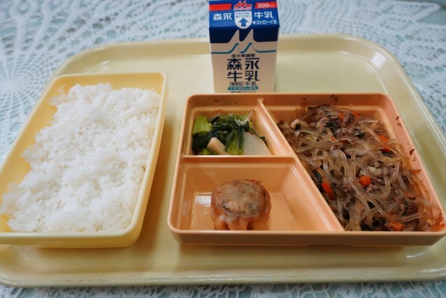 今日の献立は、ご飯、チャプチェ、味噌まんじゅう、チンゲン菜とえのきの和え物、牛乳です。