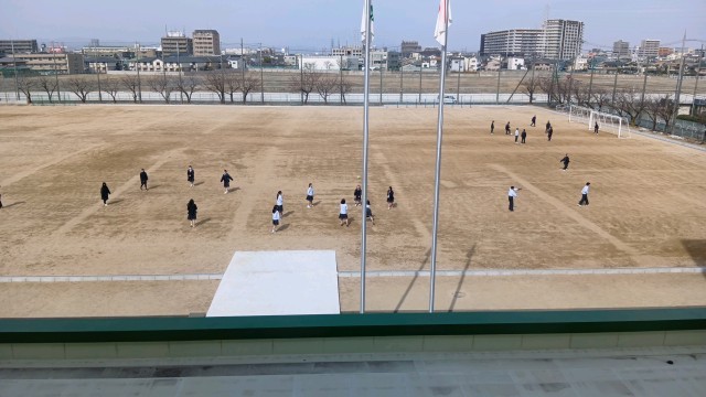 大勢の生徒がグラウンドで遊んでいます。