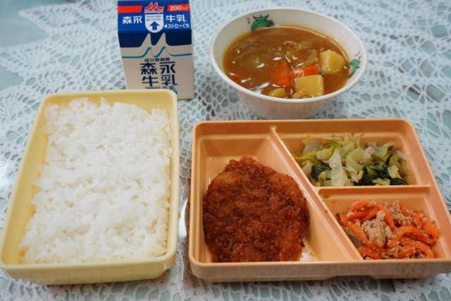 今日の献立は、ご飯、チキンカツ、チンゲン菜の炒め物、にんじんしりしり、カレーシチュー、牛乳です。