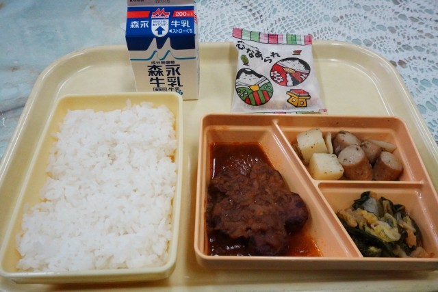 今日の献立は、ご飯、花型ハンバーグデミグラスソース、ソーセージときのこのアヒージョ風、お浸し、牛乳、ひなあられです。