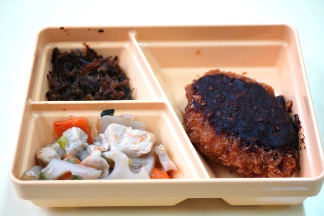 今日の献立は、もち麦ご飯、味噌カツ、レンコンのとろみ生姜、佃煮ふりかけ、牛乳です。