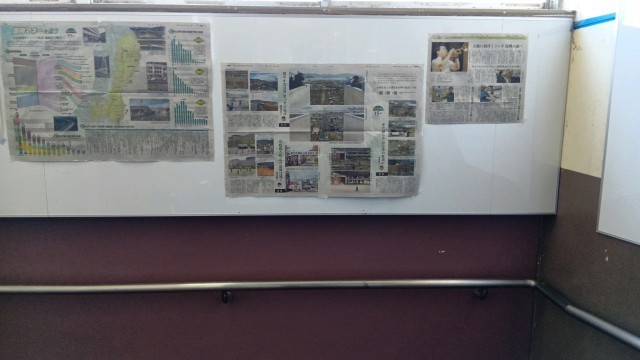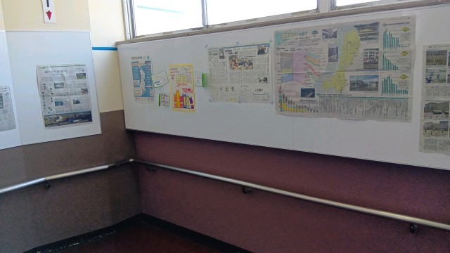 中央階段には震災に関する新聞記事が掲示されています。昼休みにしっかり読んでくれている生徒も多く見かけます。