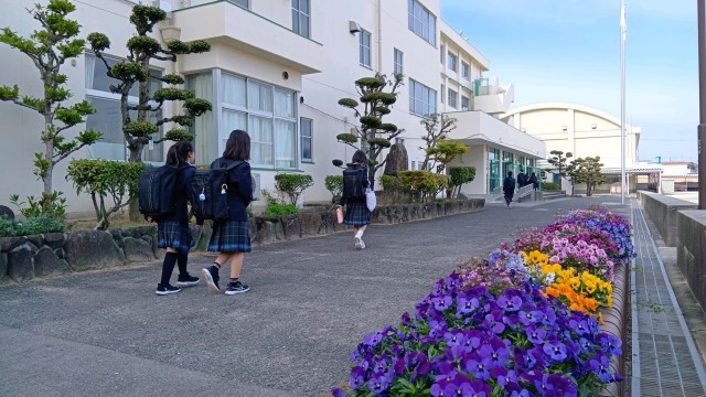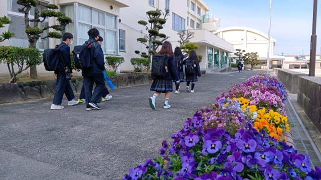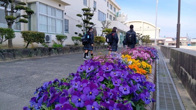 登校風景を撮影しました。花壇のスミレがきれいです。