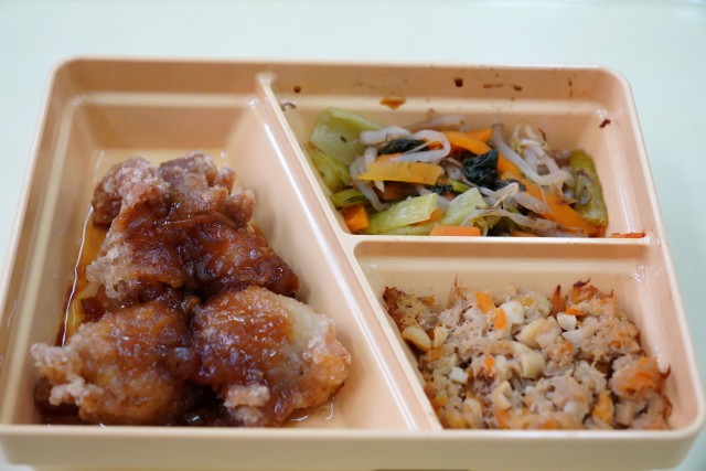 今日の献立は、白ご飯、油淋鶏、ツナ大豆ふりかけ、もやしのかつお和え、牛乳です。
