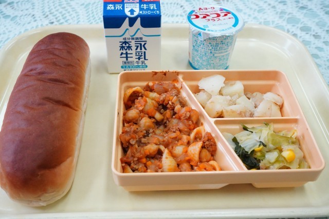 今日の献立は、黒糖パン、チリコンカーン、ジャガイモのツナ和え、ポパイソテー、ヨーグルト、牛乳です。