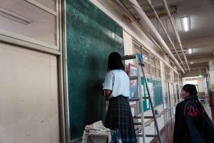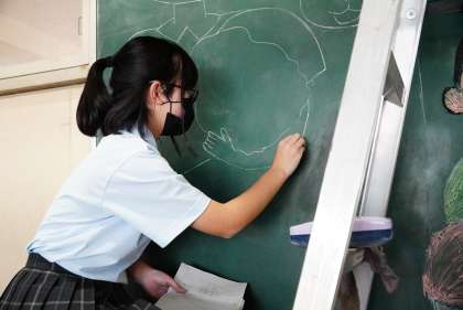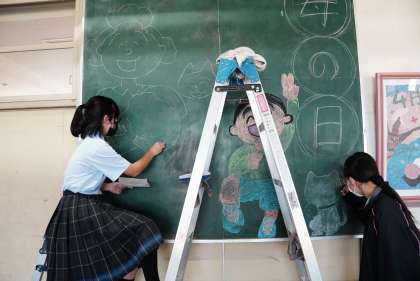 芸術部その2です。下足室前の黒板アートを作成中です。