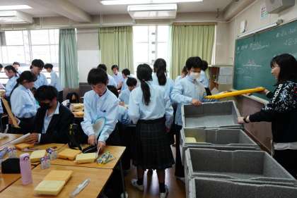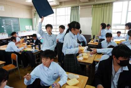 給食準備中の1年2組です。