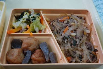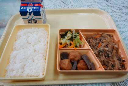 今日の献立は、ご飯、チャプチェ、チンゲン菜の炒め物、丸天の含め煮、牛乳です。