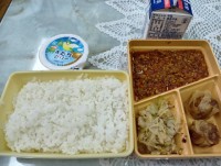 今日の献立は、ご飯、豚肉のオイスターソース炒め、かつおそぼろ、小松菜の和え物、牛...