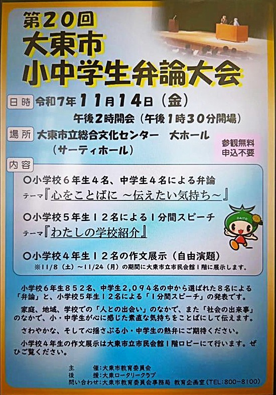 第20回大東市小中学生弁論大会が11月24日(金)にサーティホールで行われます。