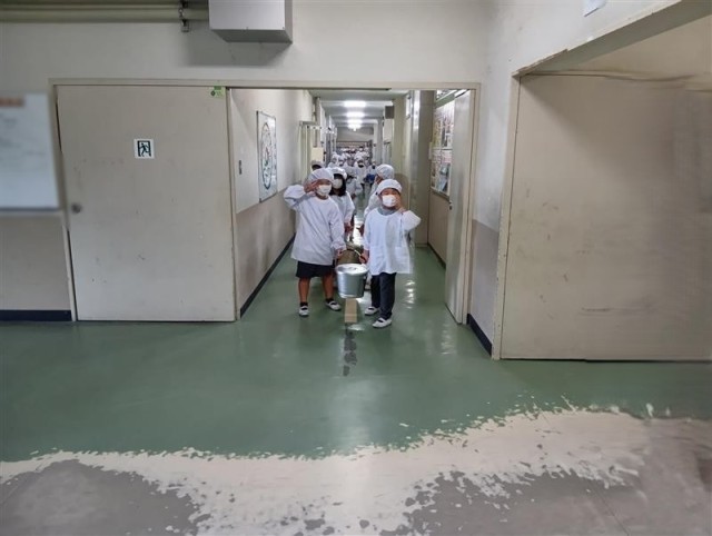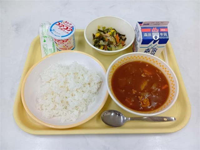 今日は、子どもたちに大人気のカレーです。米粉ポークカレー、りっちゃんサラダ、ヨーグルトでした。
