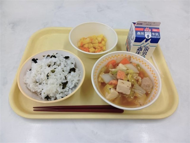 今日は、わかめご飯、ちゃんこ煮、じゃがいもソテーでした。