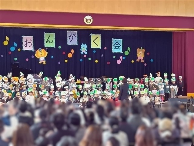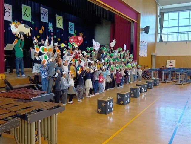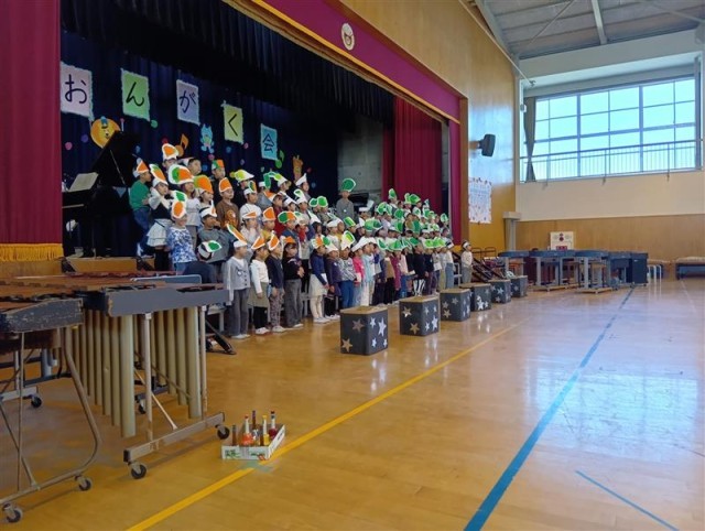 元気いっぱいの合奏、斉唱でした。 頭に乗せていたのは野菜かな。