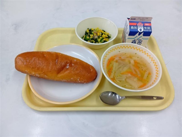 今日はみんなに大人気のあげパンと、野菜スープ、コーンソテーでした。