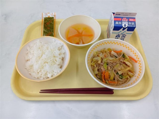 今日は春雨のひき肉炒め、大根のスープ、ご飯に海苔でした。