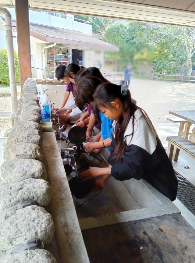 片付けも協力して行います。“来たときよりもきれいに“を合言葉に一生懸命鍋を磨いていました。