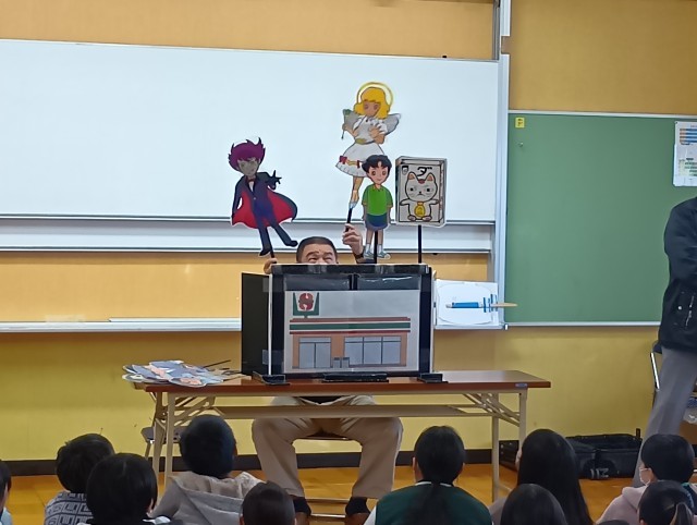 ペープサートの人形劇では、万引きが「いたずら」でなく「犯罪」であることをわかりやすく教えていただきました。また、最近増えているSNSの被害に遭わないためには、お家で決められたスマートフォンなどのルールを守ることが大切だと話されていました。