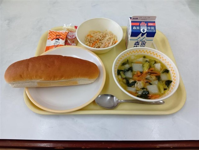 今日の給食は、白菜と肉団子のスープ、切り干し大根サラダ、コッペパンにミルクバターでした。