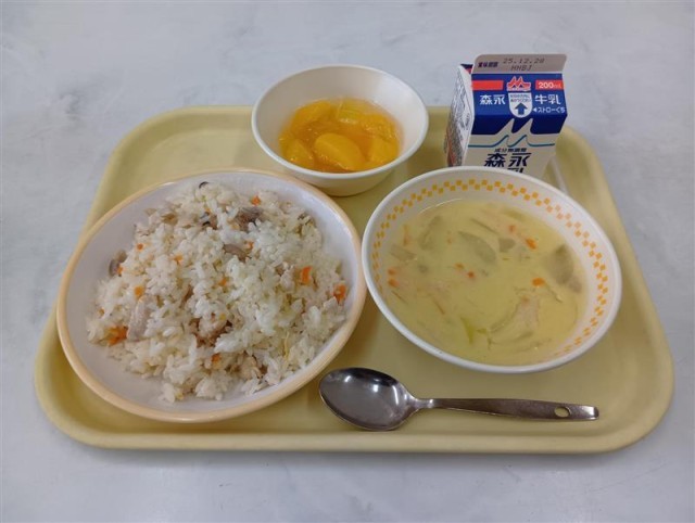 今日は、チキンピラフ、ポタージュスープ、桃カクテルでした。