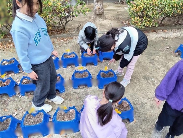 1年生ががんばって育てているチューリップが芽を出しました。