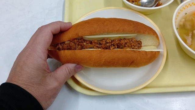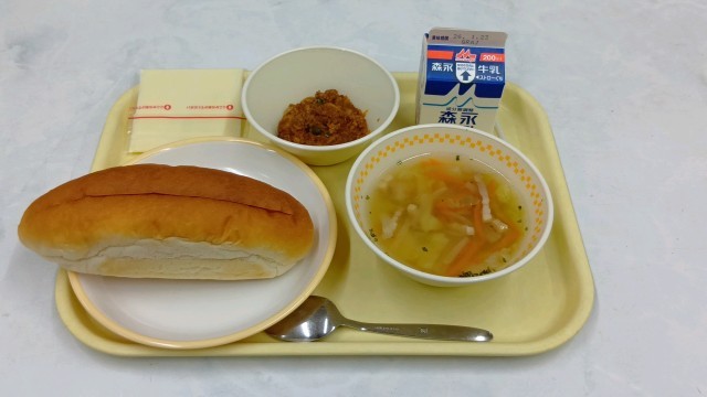 今日はコッペパンとパンの間にはさむ、ミートサンド、スライスチーズと、野菜スープでした。