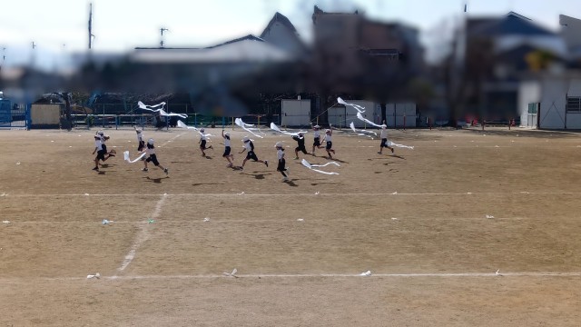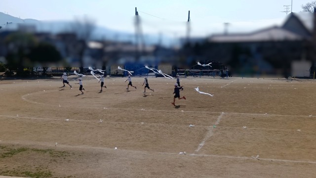 一生懸命に走って、凧をあげていました。みんながんばれ!