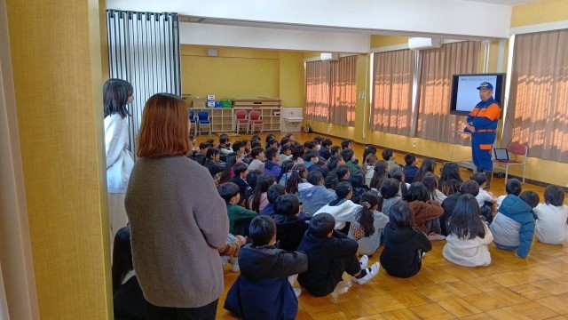 3年生が学年合同での社会科学習で、防災のことについての学びで、実際の地域の消防団の人に来てもらいました。