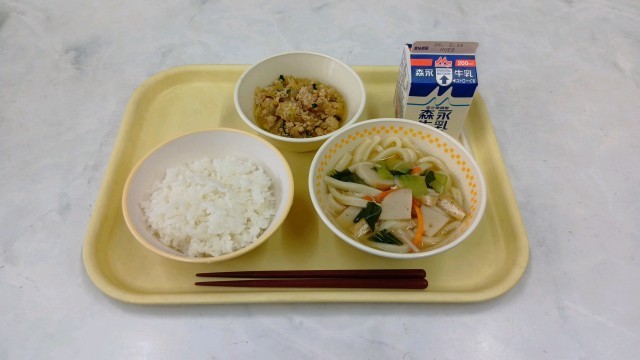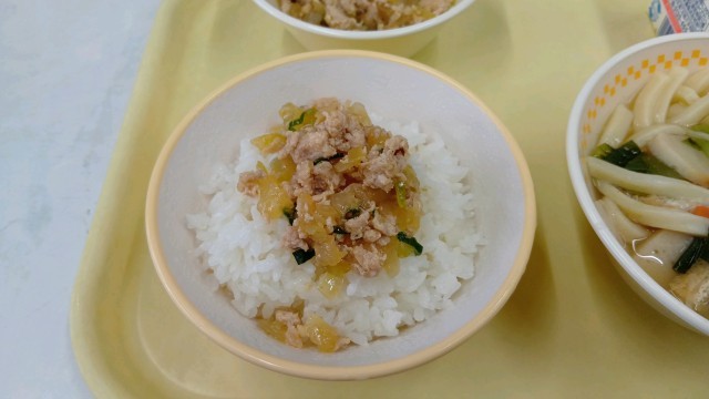 今日は、きざみうどん、鶏のそぼろ丼でした。