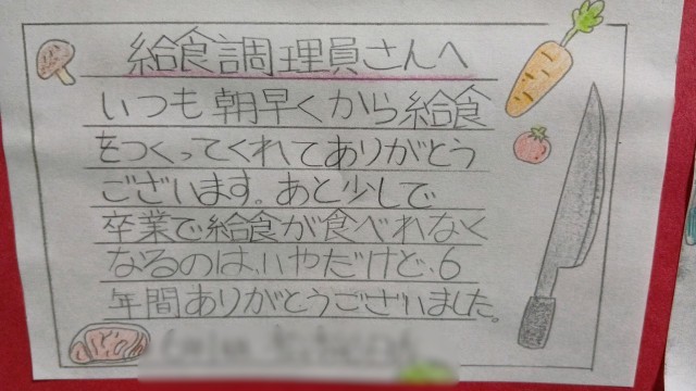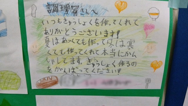 子どもたちのいろんな感謝の言葉が綴られています。調理員さん、本当にいつも美味しい給食をありがとうございます。