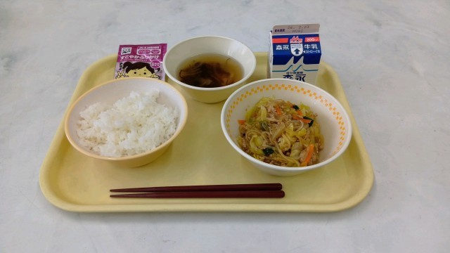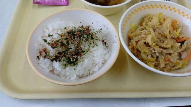 今日は、春雨のひき肉炒め、もずくスープ、ご飯にふりかけでした。
