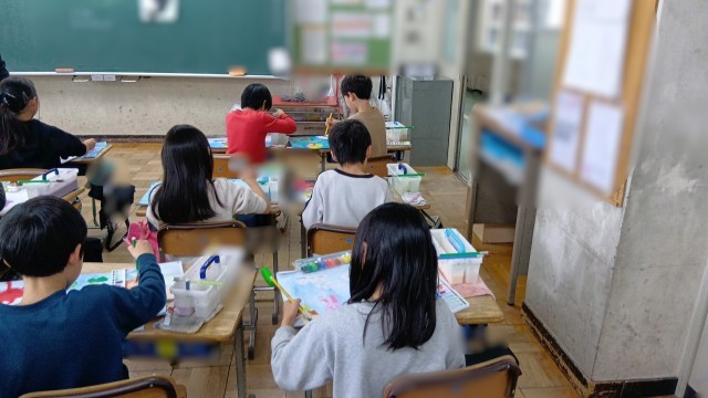 3年生の教室では絵をみんなで描いていました。何やら丸い穴をあけての絵のようですが、そこには誰かの顔が入るのかな。