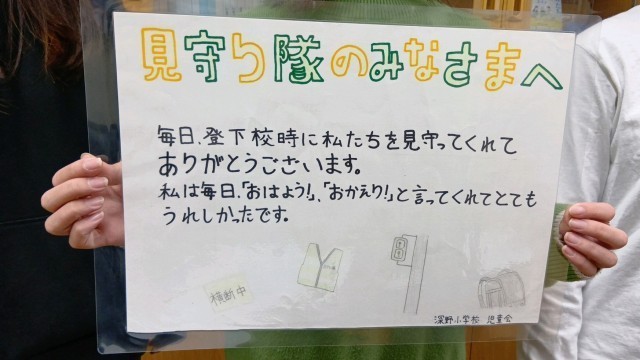 児童会の子どもたちが、いつも朝早くから見守っていただいている見守り隊の皆さまへということで、メッセージを書きました。