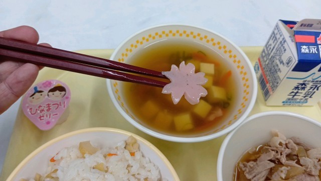 ちらし寿司、すまし汁、豚肉と大根の煮物、そしてひな祭りゼリーでした。
