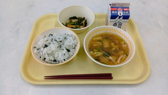 今日は、わかめご飯、豚汁、小松菜と平天の煮びたしでした。